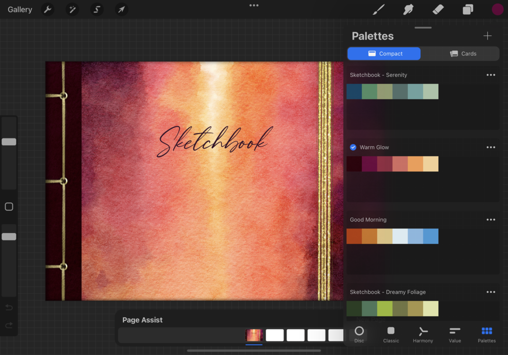 “Warm Glow” Blank Procreate Sketchbook, ready to use with Procreate’s new Page Assist tool for 5.2 or higher. This sketchbook comes with blank pages and a beautiful cover featuring a loose watercolor background and Japanese style “binding” to inspire your sketches.